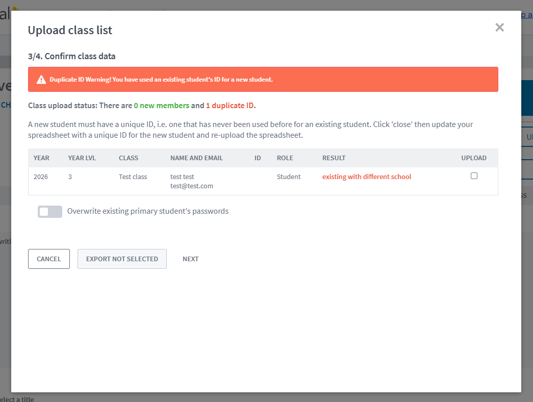 Step 4 - After this loads you will be asked to Confirm Class Data. Any errors with your spreadsheet upload will be flagged at this stage.