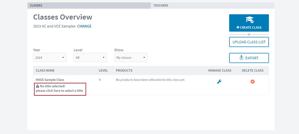 Step 5 - You will now be able to view your class in the Classes Overview screen. You will see a grey hazard symbol with an error message next to each class that is missing a product. Click the error message to open the Manage Class Products window.