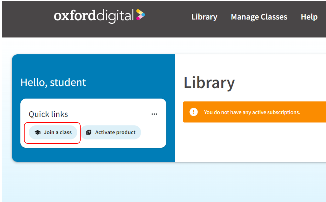 1. Login to your Oxford Digital account and click the Join a Class button on the Library homepage.