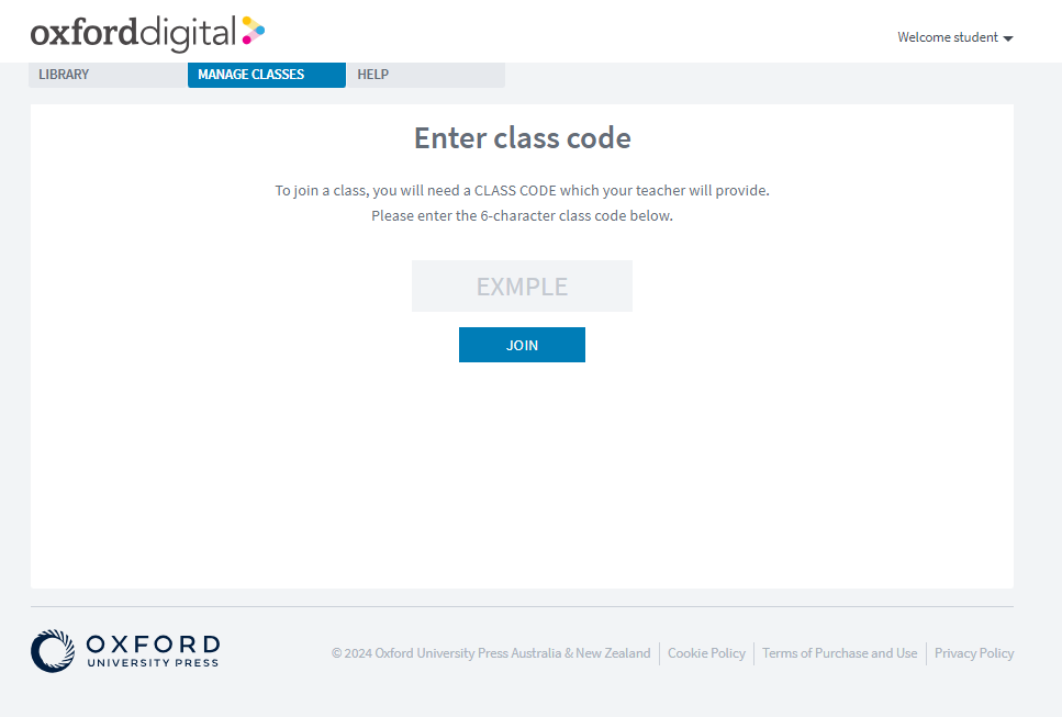 If your teacher has shared a class code with you, simply enter the code into your Oxford Digital account to join the class. A class code is a 6-digit alphanumeric code, for example 55CAB6.