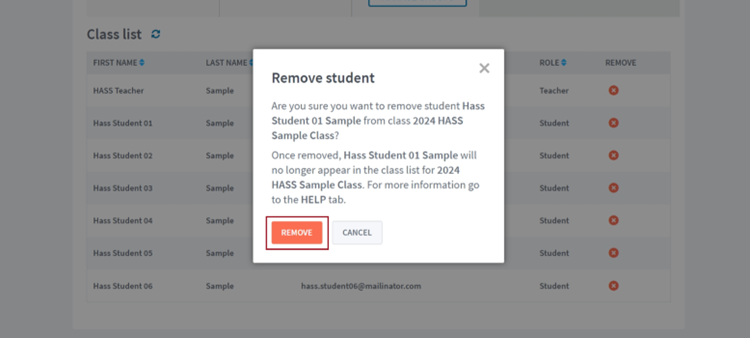 Click the red cross icon to remove a user from the class.
